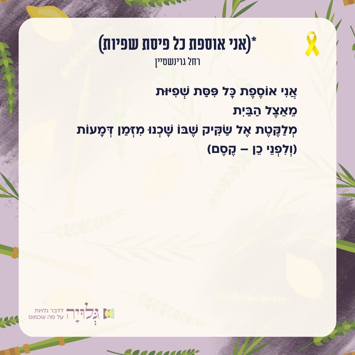 שֶׁלֹּא נַקְדִּים לַחְגֹּג. שֶׁלֹּא נְאַחֵר לְהוֹדוֹת. שֶׁלֹּא נַעֲזֹב יָדַיִם זֶה לָזוֹ, אֵלּוּ לְאֵלּוּ.