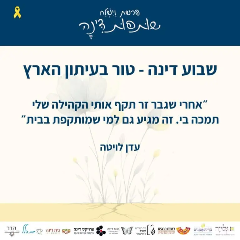 סמנו ביומנים - פעילות שבוע דינה הבאה תתקיים בעז״ה בתאריכים: י״ב-י״ח בכסלו ה׳תשפ״ז, 22-28.11.2026 ב-2026 יתקיים בעז״ה בפעם הראשונה גם יום עיון מקדים, ב: א׳ בכסלו ה׳תשפ״ז 11.11.2026 נודה במילוי הטופס המצ״ב.