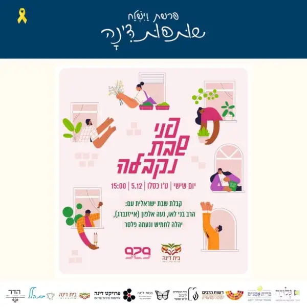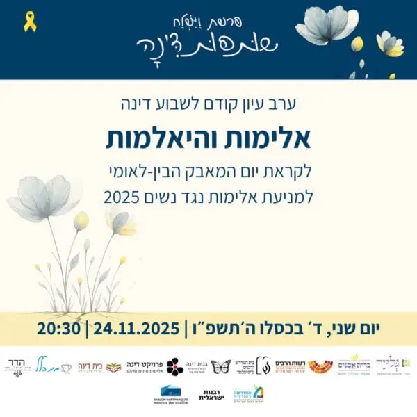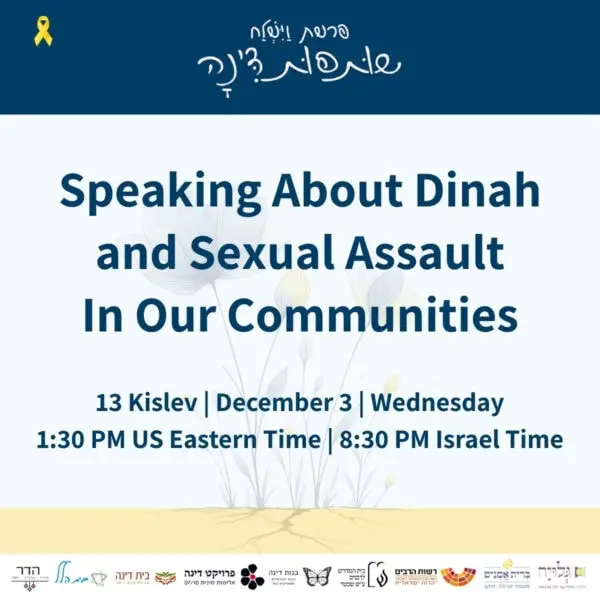 בין התאריכים י׳-ט״ז כסלו ה׳תשפ״ו 30.11-6.12.2025 – לאורך השבוע המקדים את קריאת פרשת ״וישלח״ – מתקיימים אירועים שונים של לימוד והתייצבות לצד דינה. עקבו אחר העדכונים כאן והצטרפו אלינו להרצאות והתכנסויות.