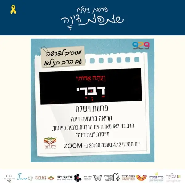 ביום חמישי, י״ד בכסלו ה׳תשפ״ו, 4.12.2025 בשעה 20:00 תתקיים שיחה על פרשת השבוע בליווי שירה העוסקת בפגיעות מיניות שתתקיים במכון הדר, מתוך שיתוף פעולה עם משיב הרוח