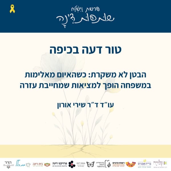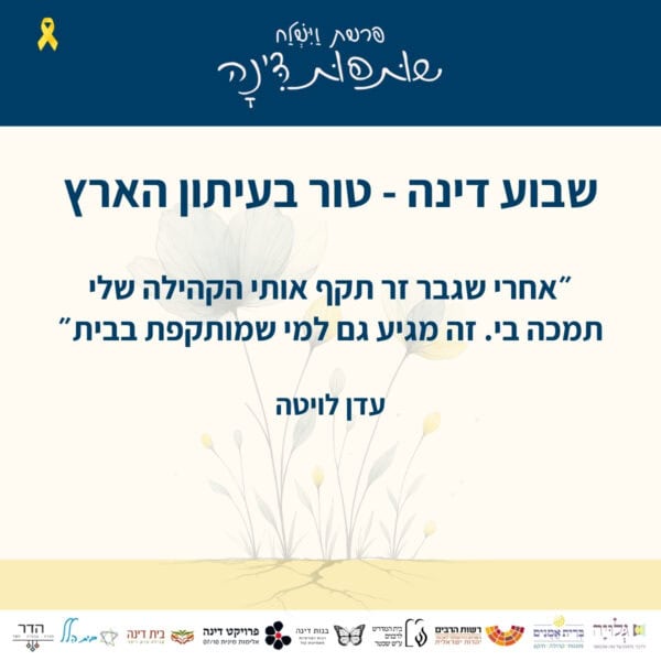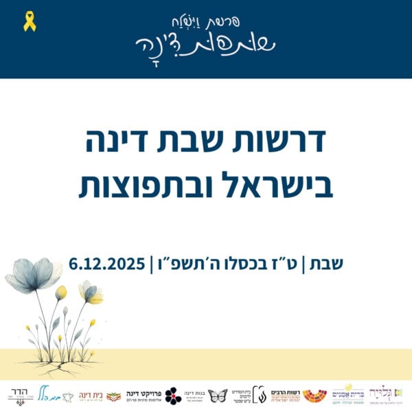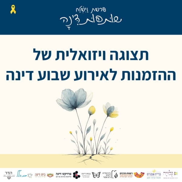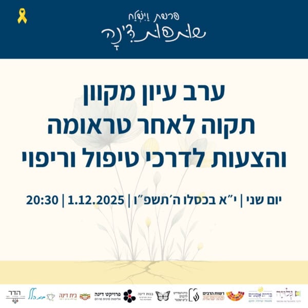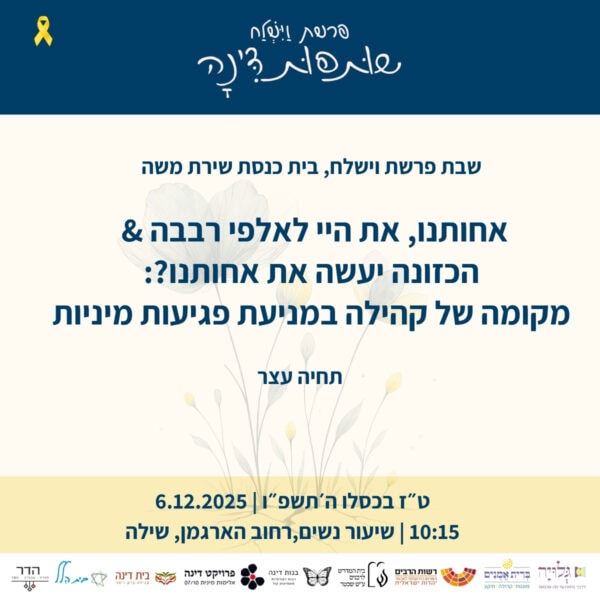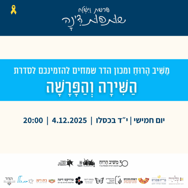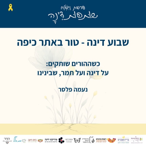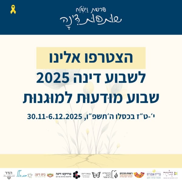 בין התאריכים י׳-ט״ז כסלו ה׳תשפ״ו 30.11-6.12.2025 – לאורך השבוע המקדים את קריאת פרשת ״וישלח״ – מתקיימים אירועים שונים של לימוד והתייצבות לצד דינה. עקבו אחר העדכונים כאן והצטרפו אלינו להרצאות והתכנסויות.