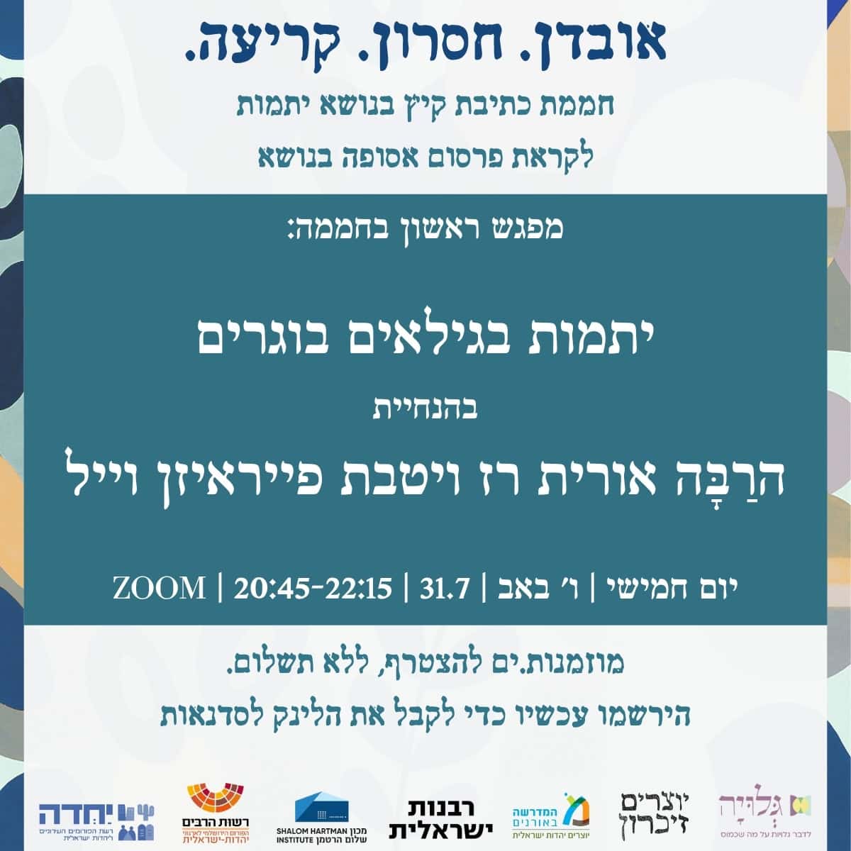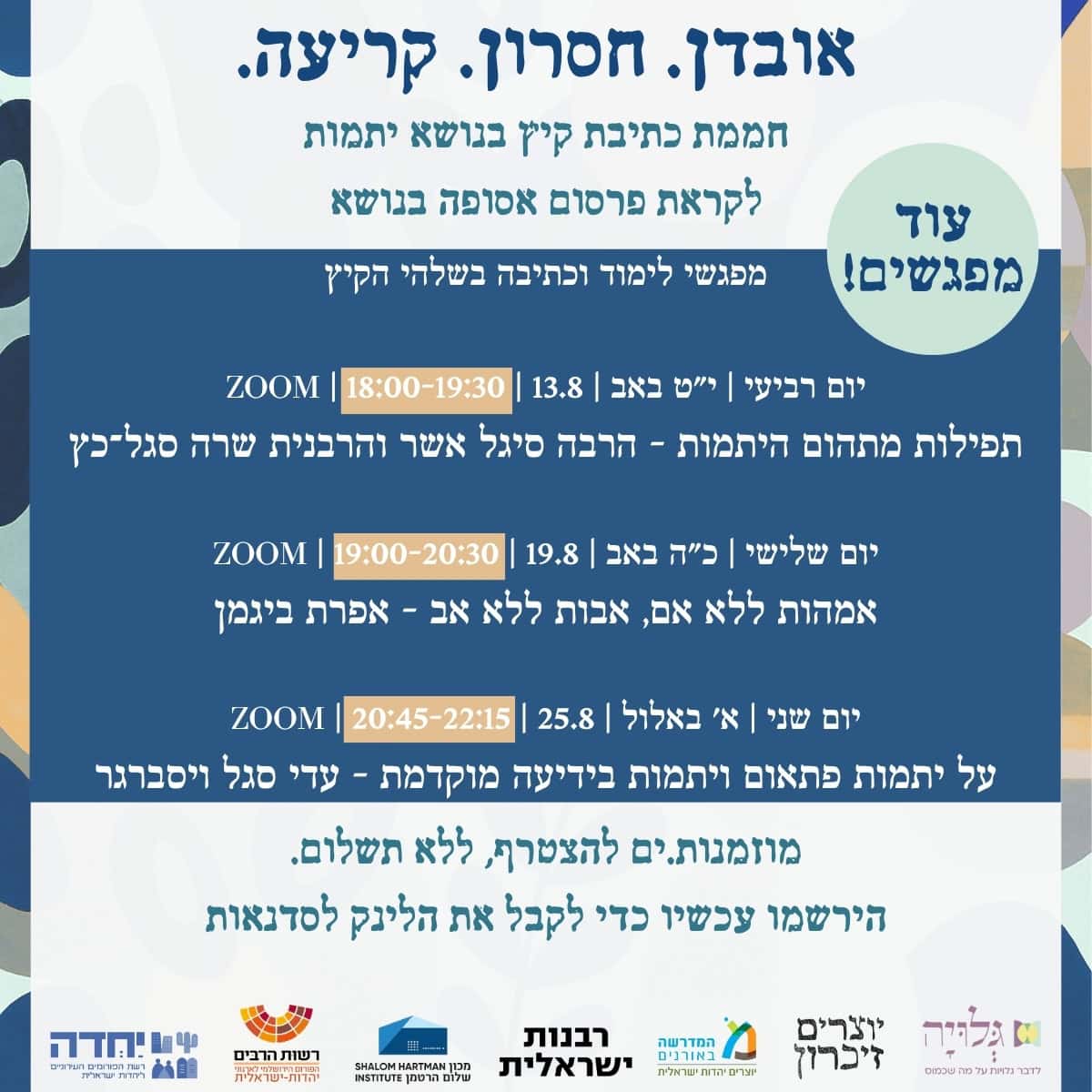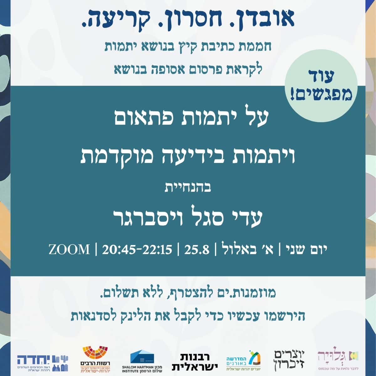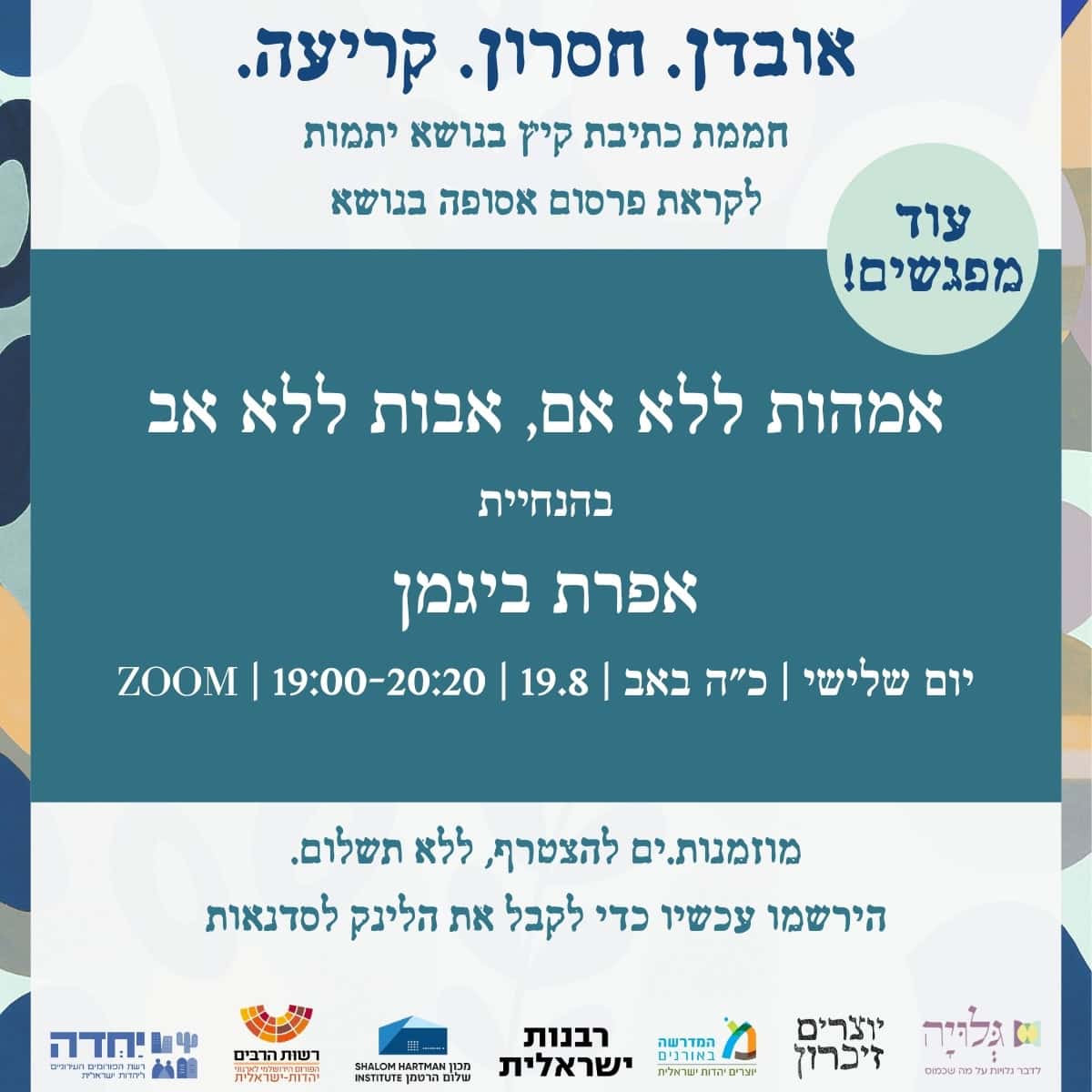 בקיץ שעבר קיימנו חממת כתיבה כשעמלנו על עריכת האסופה על חרמות והדרה חברתית, ועתה נפתח שוב חממת כתיבה בנושא יתמות שתתקיים בזום. היא תתחיל בעוד כמה ימים, ותתפרש על פני חודש אב. אפשר להירשם לכל שלושת המפגשים, ואפשר רק לחלקם. המפגשים הינם ללא תשלום, אך דורשים הרשמה מראש.
