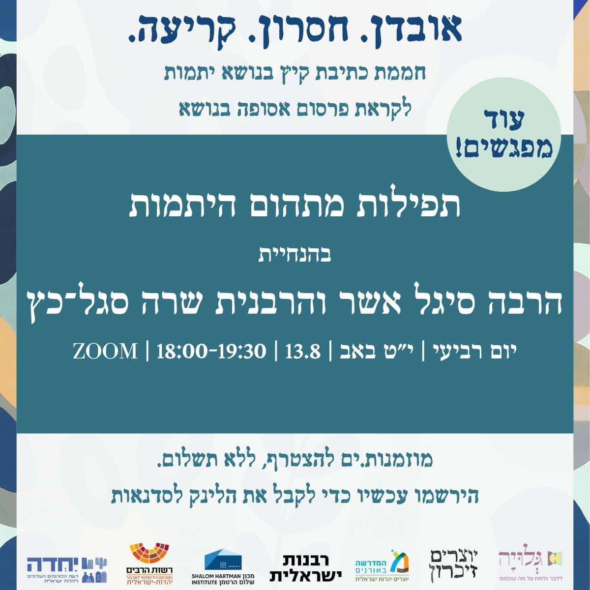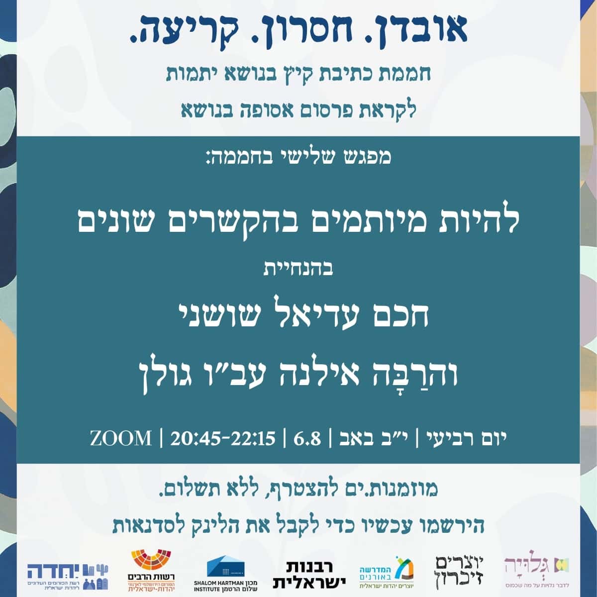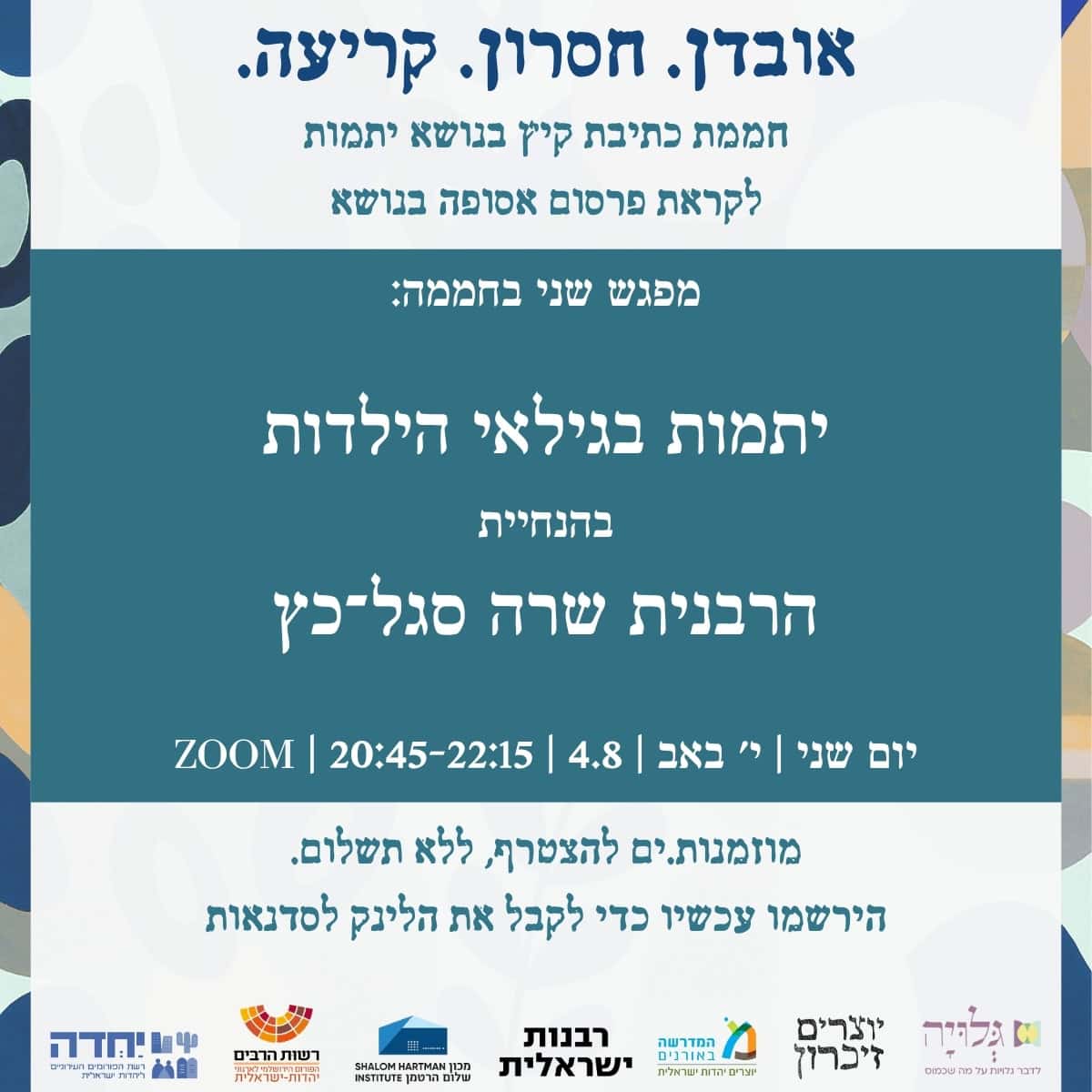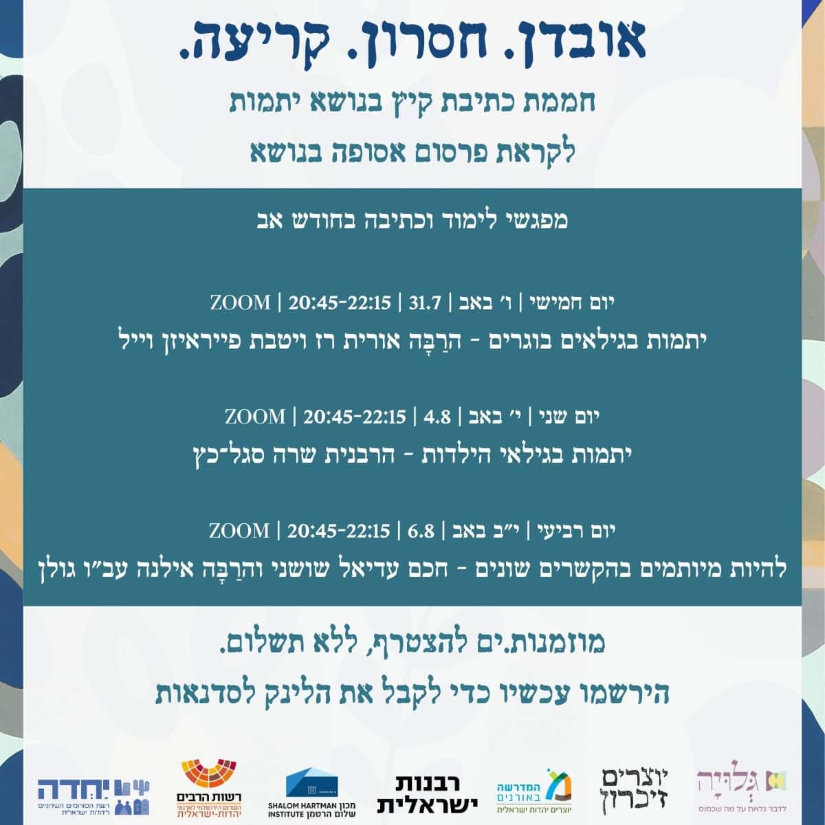 בקיץ שעבר קיימנו חממת כתיבה כשעמלנו על עריכת האסופה על חרמות והדרה חברתית, ועתה נפתח שוב חממת כתיבה בנושא יתמות שתתקיים בזום. היא תתחיל בעוד כמה ימים, ותתפרש על פני חודש אב. אפשר להירשם לכל שלושת המפגשים, ואפשר רק לחלקם. המפגשים הינם ללא תשלום, אך דורשים הרשמה מראש.