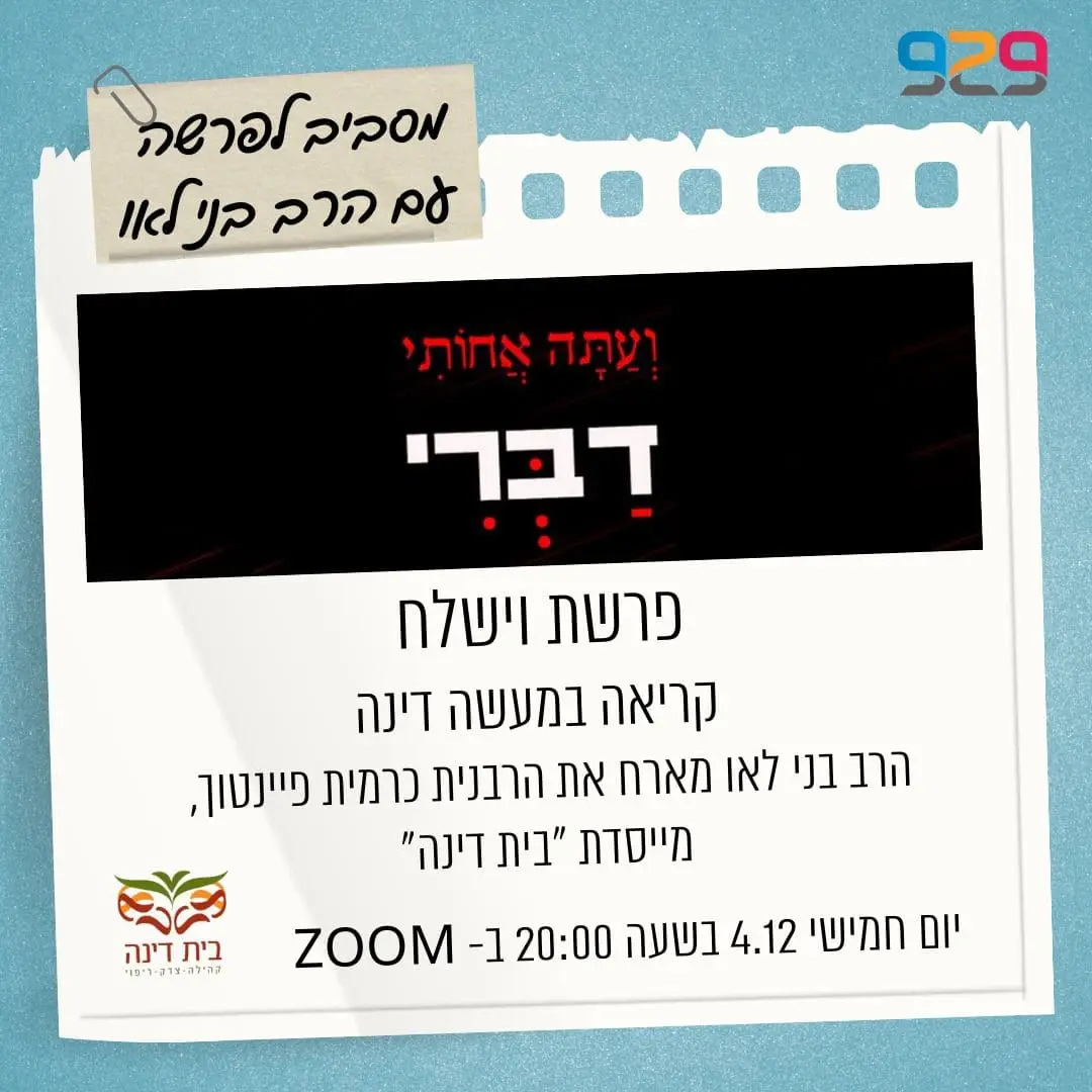 שיעור לקראת קריאת פרשת ׳וישלח׳ ביום חמישי י״ד בכסלו, 4.12 במסגרת השיעור השבועי של הרב בני לאו. בשיעור על מעשה דינה תתארח הרבנית כרמית פיינטוך, ממייסדות בית דינה וחברת צוות ההובלה של שותפות דינה 2025.