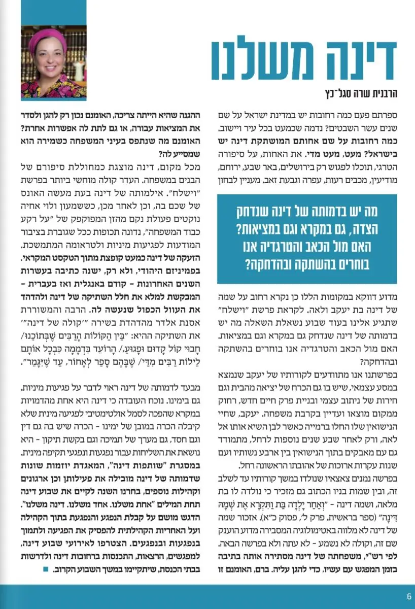הרבנית שרה סגל־כץ בטור לקראת הפעילות של שבוע דינה, בין פרשת ׳ויצא׳ ל׳וישלח׳.
