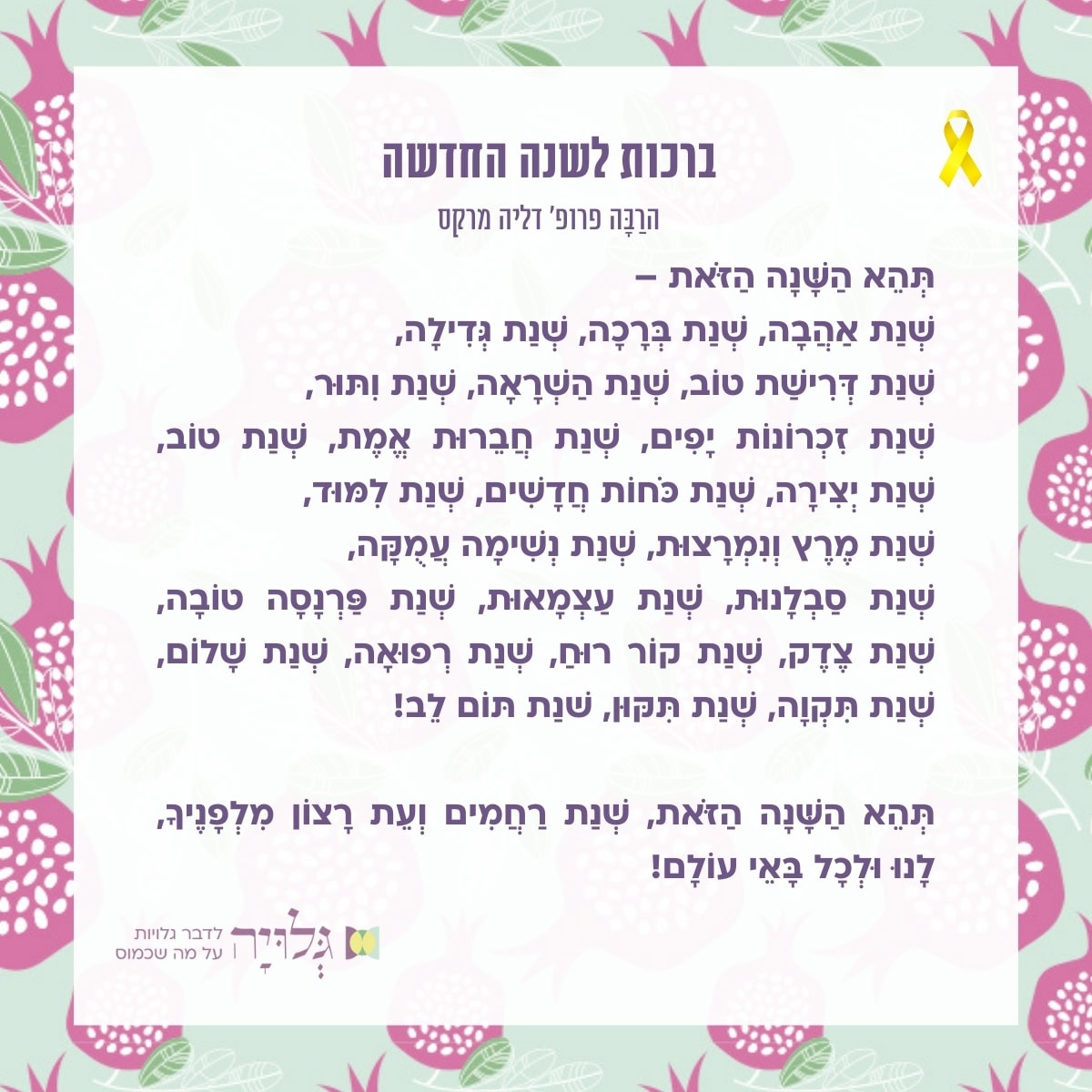 על סף שנה חדשה, עם מורכבות הרגשות של ציפיה למה שיבוא, אנחנו מבקשות לאחל שתהיה שנה טובה. טובה יותר מן הכאב, מן הדאגה ומן הפחד ששוכנים בקרבנו. טובה יותר מכל מה שכן מעניק לנו עוגנים, יציבות ויכולת לשאת מבט קדימה – שנזכה להיעטף בחוסן וברוך גם יחד.