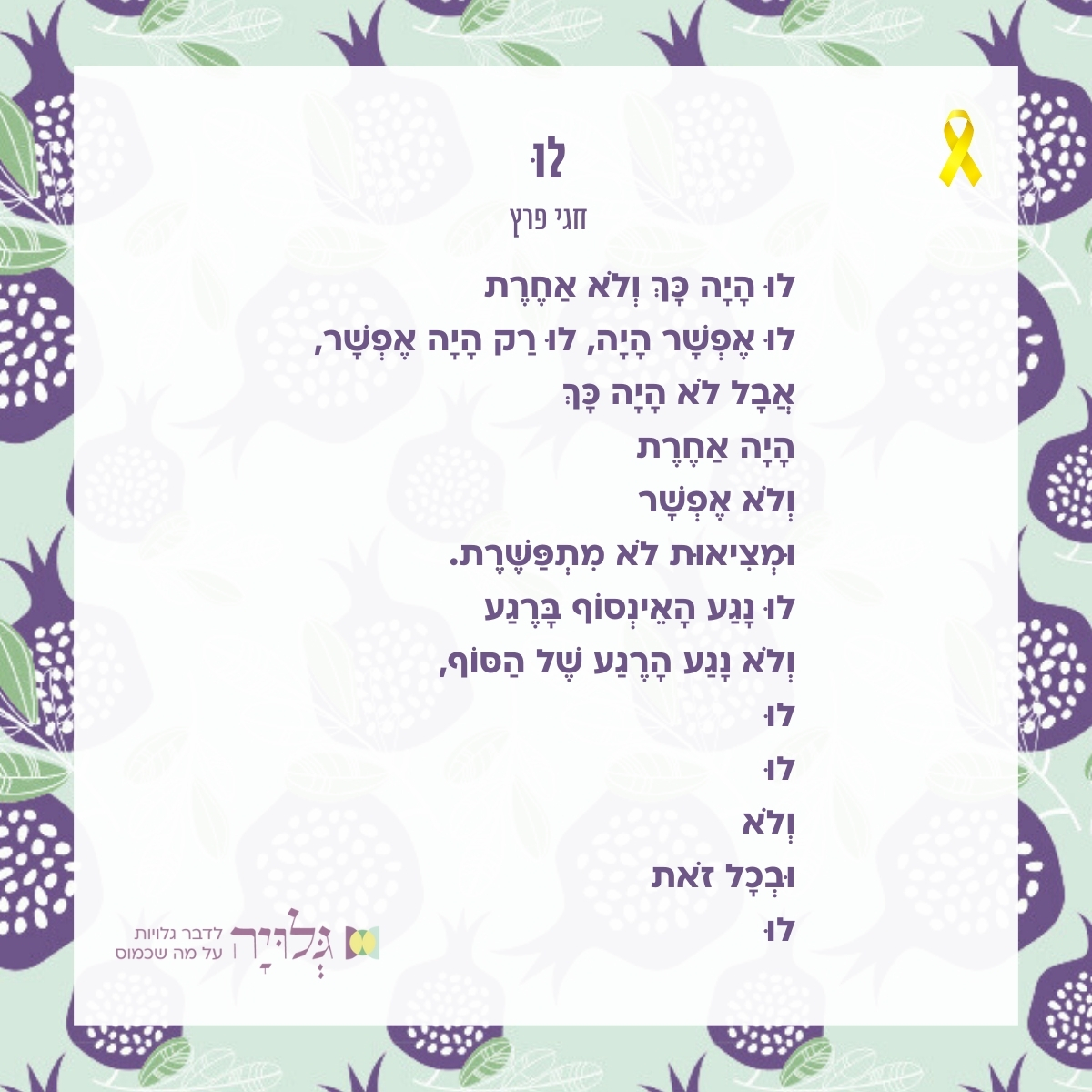 קריאה זו מהדהדת במיוחד בשנה הנוכחית, ולא רק בהקשר אישי. העובדה שיש עדיין חטופים שטרם שבו, בחווינו אובדנים כואבים ושהדאגה ממשיכה ללוות אותנו – מעלה את מילת ה”לוּ”, את מחשבות ה”אילו היה כך ולא אחרת”. אך השיר מזכיר כי ה”לוּ” איננו רק החמצה וגעגוע, אלא גם דחף פנימי להתעקש, להוסיף לנוע, לשנות. על כן, אותו “ובכל זאת / לוּ” החותם את השיר, מזכיר לנו כי העובדה שהלחן האינסופי של לוּ ועוד לוּ הוא גם שער ודלת ולא רק קיר וגדר. הלוואי וחירותם של החטופים תתקיים במהרה, הלוואי וישקטו הסערות.