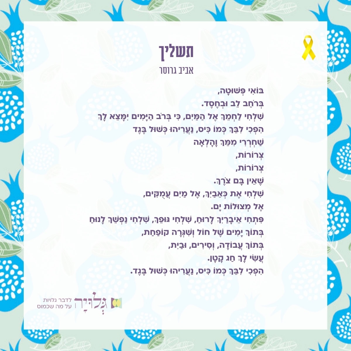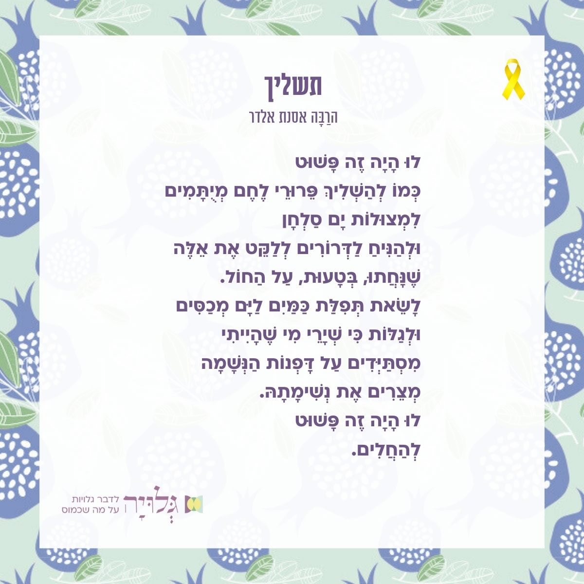 בתוך ימי ראש השנה הבאים עלינו נבקש על שעתיד להיות אך גם נשליך את שהיה, בתקווה שאכן אפשר להיפרד ממה שמצר את הנשימה. שיר חדש של הרבה אסנת אלדר יכול ללוות בעת קיום טקס ה’תשליך’ ויכול להיות תפילת המעבר בין השנה הנחתמת לבין כניסת החג.
