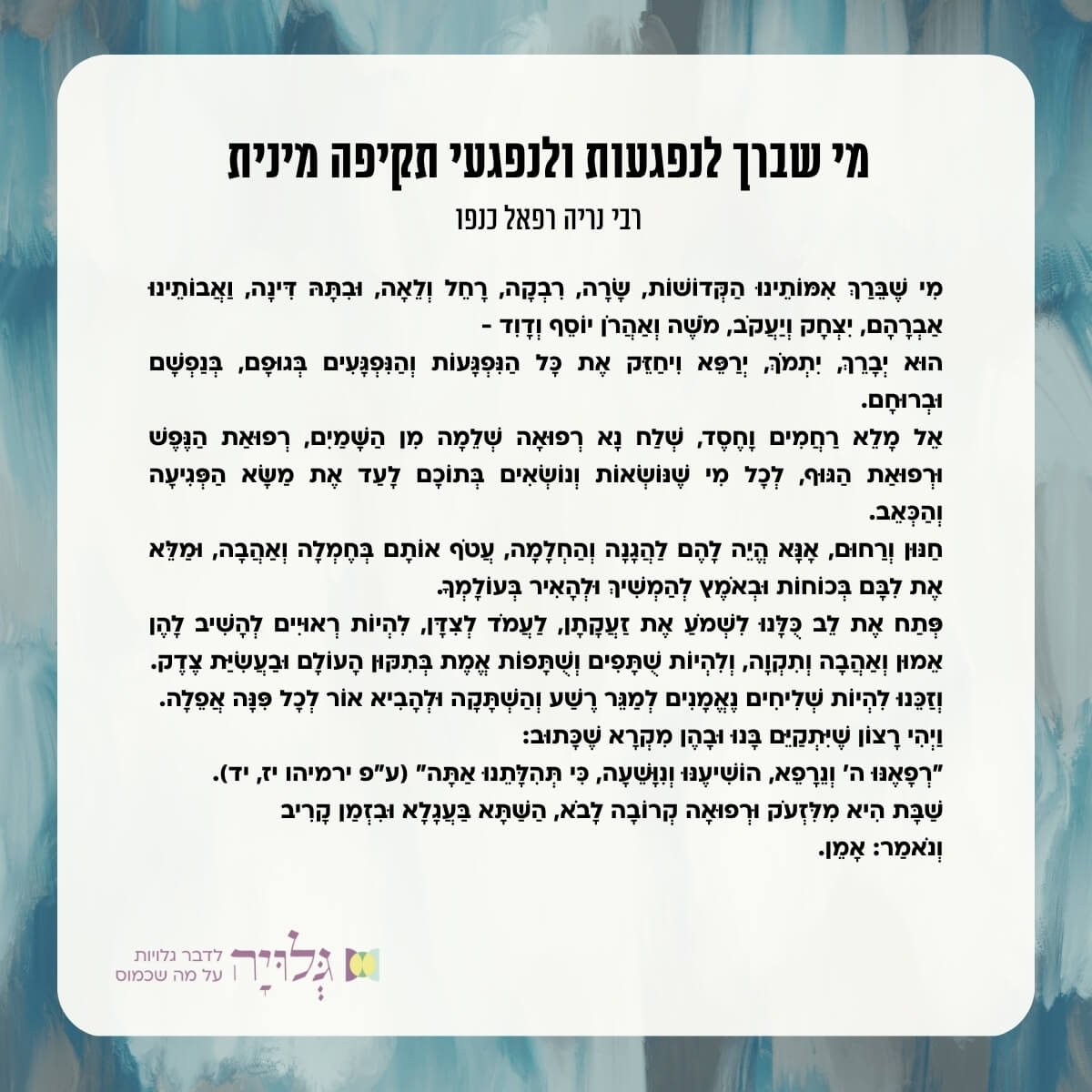 אחת מהתפילות שנכתבו לשבת דינה לפני שנה מיועדת להיאמר בבתי הכנסת כתפילה ציבורית ולא כהכוונה אישית, עבור נפגעות ונפגעי תקיפה מינית. את התפילה חיבר רבי נריה רפאל כנפו במיוחד לשבת ״וישלח״, כדי לבטא את הייחולים הללו, אחרי שקוראים את סיפור אונס דינה. תפילה זו יכולה להיאמר גם בכל עת אחרת והיא נעה בין הענקת קול לנפגעות לבין הענקת קול לנפגעים ובכך מזכירה לנו כי האחריות והדאגה היא לכולם.
