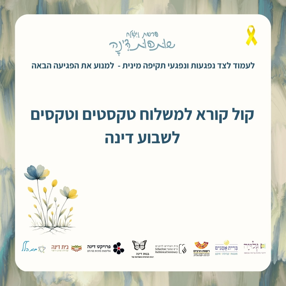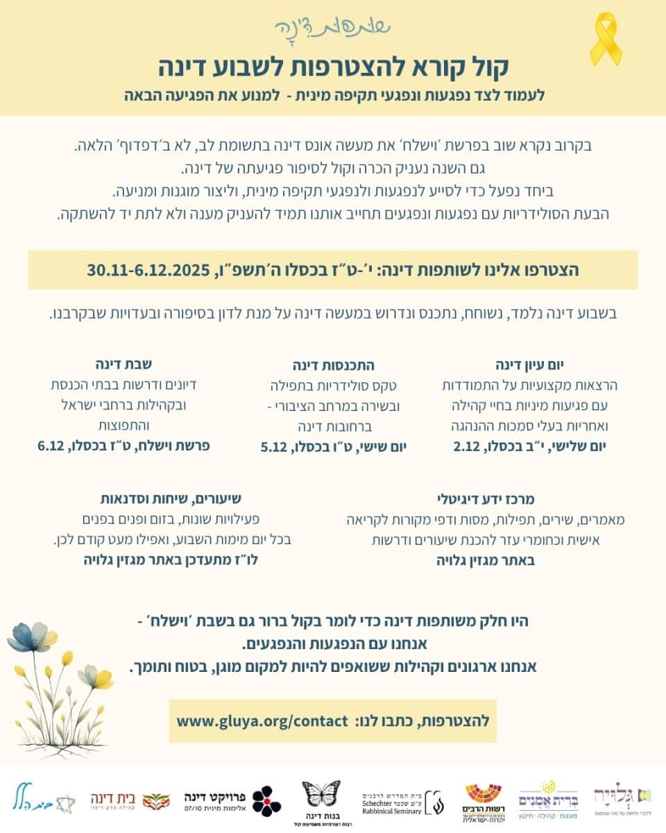אנו, בצוות גלויה, לצד בנות דינה, פרוייקט דינה, בית דינה וארגונים אחרים יוצאות בקריאה להשתתף בפעילויות של שבוע דינה. אנו קוראות להירשם ולקיים שיעורים, טקסים ודרשות ברחבי ישראל והתפוצות. בה בעת אפשר להירשם על מנת להשתתף כקהל ולא בהכרח להוביל עשיה בתחום. קריאתנו מבקשת להניח את היסודות להגברת המודעות למחוייבות אל המניעה והמענה לפגיעות מיניות. כדאי לעקוב אחר הפרסומים שלנו בשבועות הקרובים ולהצטרף לאירועים פיזיים או מקוונים:
