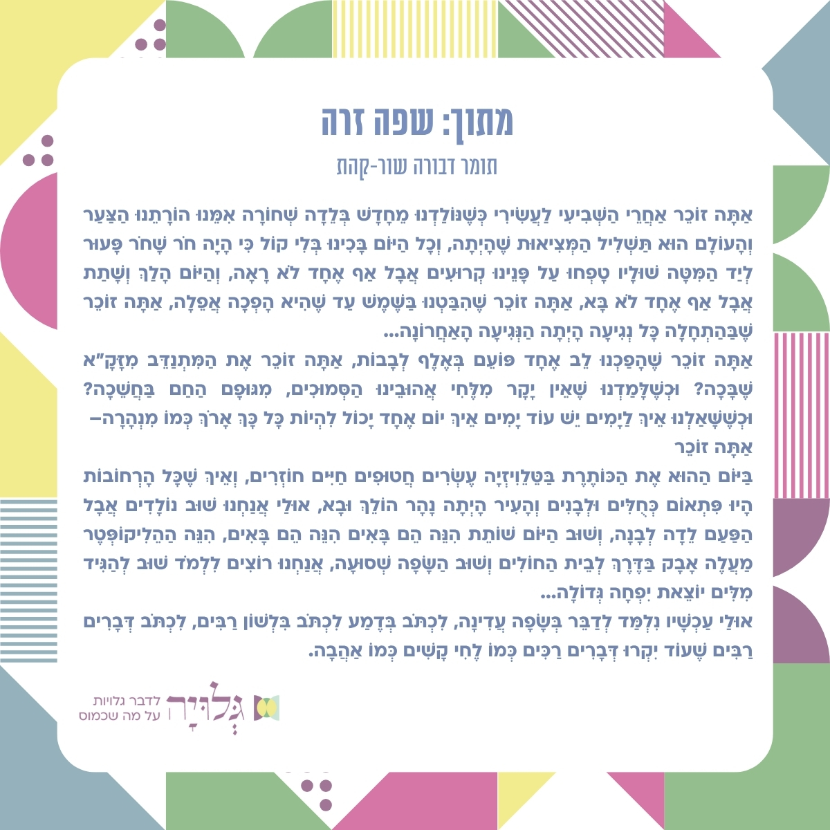 לקריאת השיר השלם ״שפה זרה״ מאת תומר דבורה שור־קהת >>